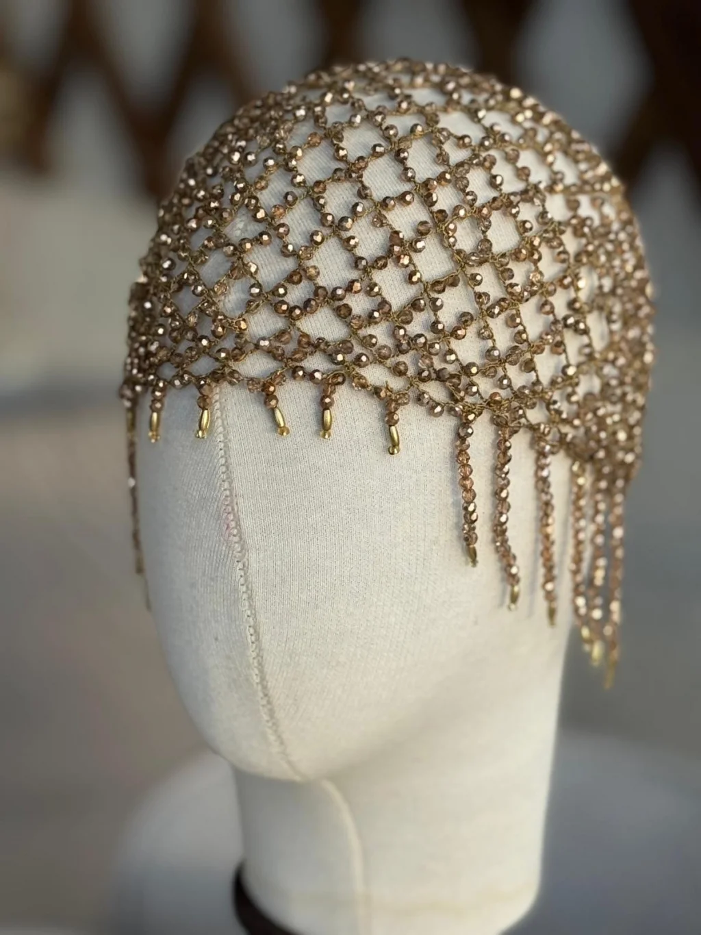Gold tonlarında kristal taşlarla elde örülerek hazırlanan bu özel tasarım stiline güçlü ve dikkat çekici bir dokunuş katar.